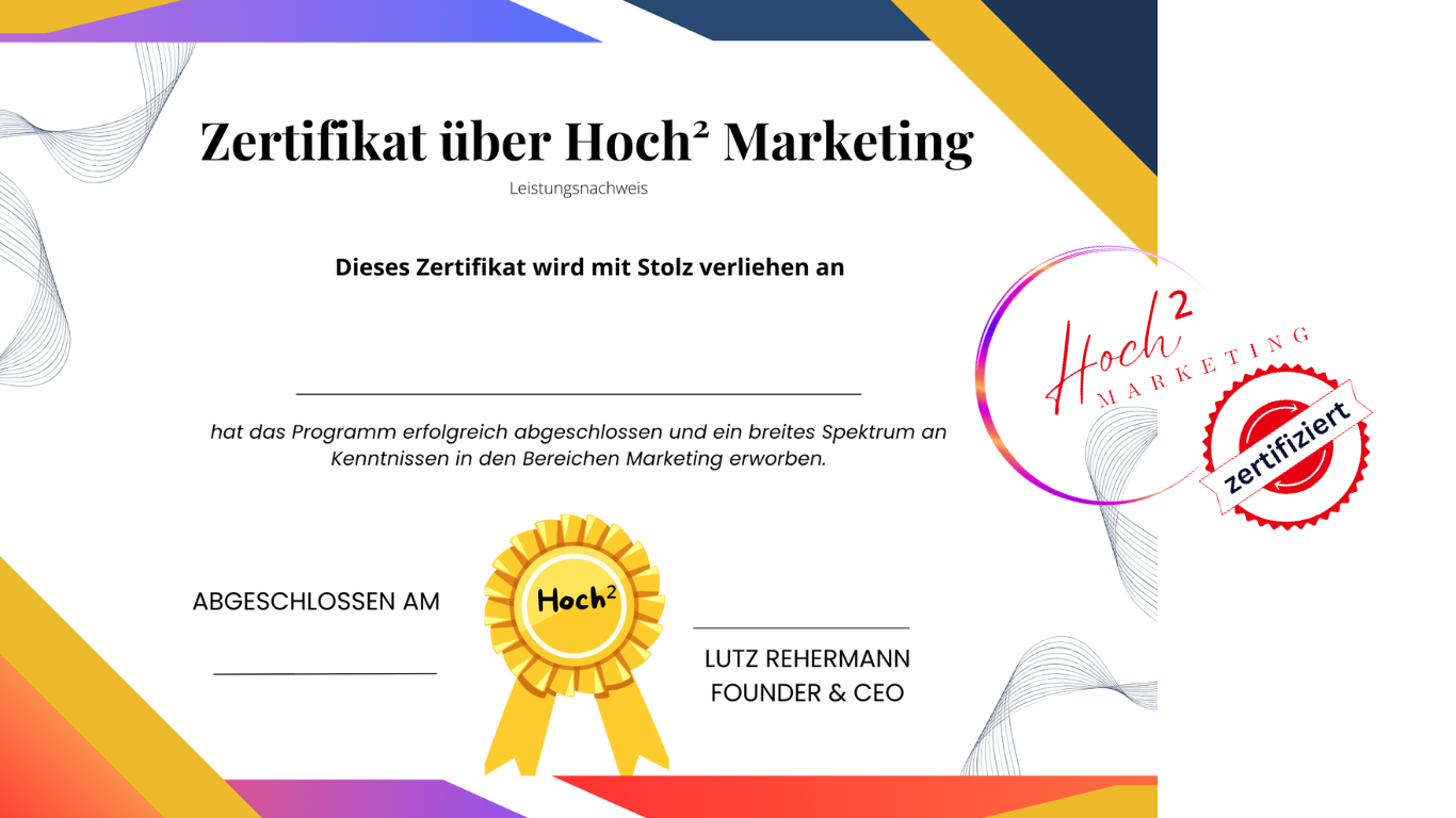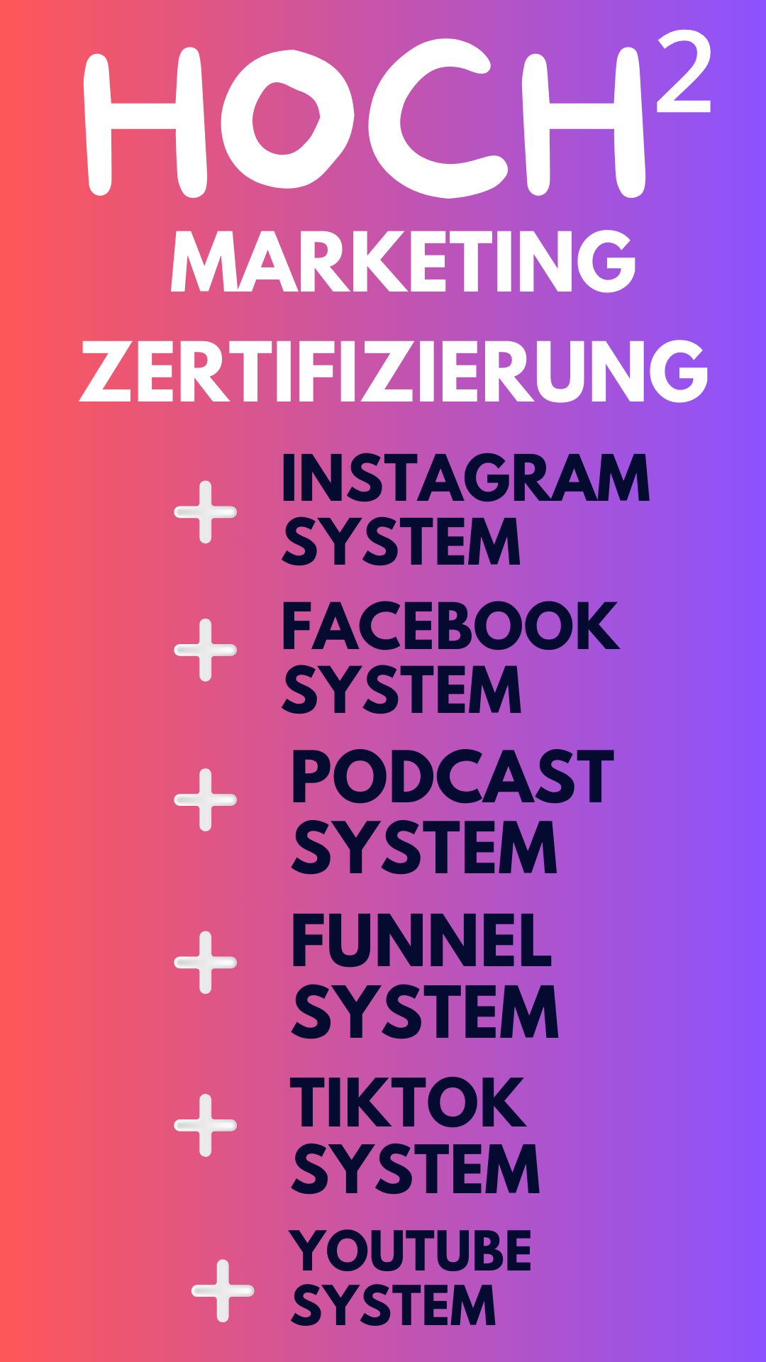 Alles Schritt für Schritt und nachweislich mit schnellen Ergebnissen. Das Beste daran: Sobald Sie Hoch² Marketing Certifiziert sind, werden Sie sofort mehr Einnahmen und Respekt erhalten.